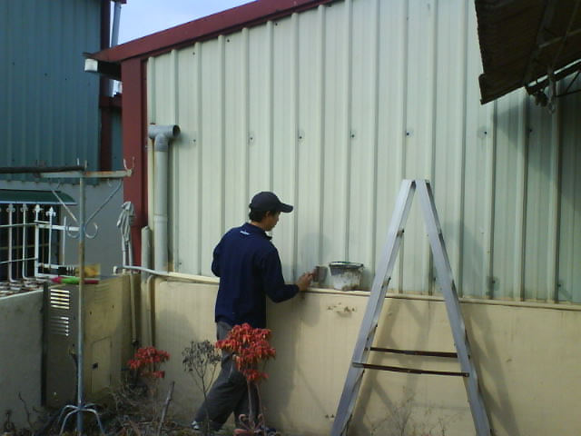 外墻│墻壁防水工程 ~~有全面性防水的心態(tài)才不會(huì)造成抓這裡漏那里的情況. 將可能造成漏水的必須施工處整理清潔, 此工程是采用外墻瓷磚面專用的透明防水材, 施作全面性包覆, 鐵皮屋烤漆浪板搭接處,還有釘頭補(bǔ)上填縫材(速利康).