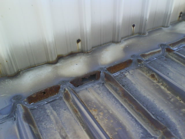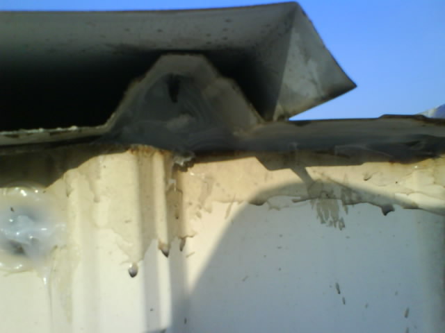 高雄抓漏-鐵皮屋漏水修繕 因凸出的部位擋住泄水溝,造成一下雨就會積水無法流出,時(shí)間久了導(dǎo)致鐵皮屋銹蝕,而造成漏水.原因?yàn)?鐵工施工不慎.首先應(yīng)觀察別處是否還有漏水的可能性,將漏水施工處做全面性處理,以防止水的無孔不入的特性